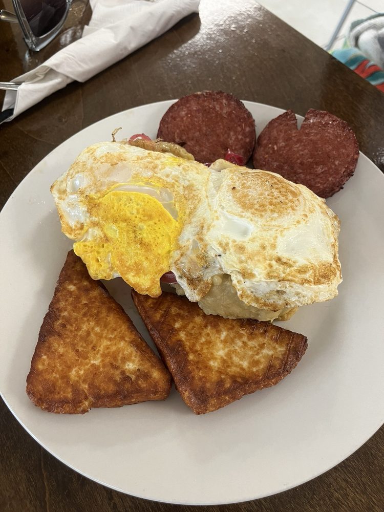 Eggs scramble, fried, or poached with bacon, ham or sausage n toast home fries or grits or make it a sandwich and add cheese and extra meat for an additional charge.